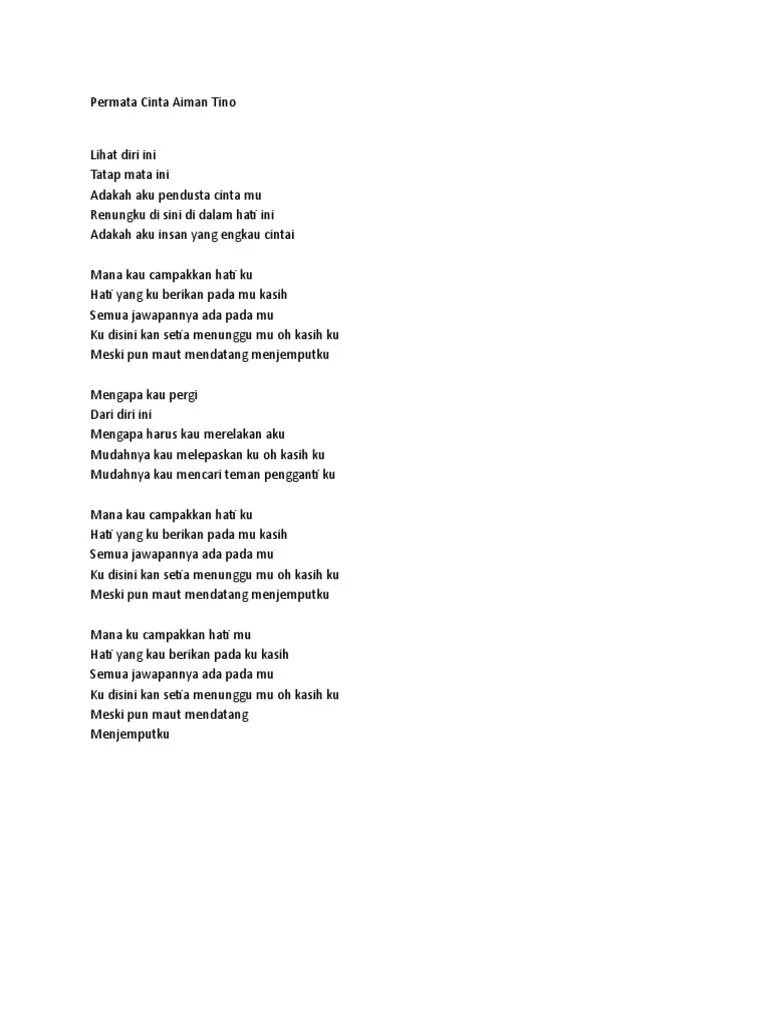 Lamihat diri ifni tatgap mata cini admdakah aku pendusta ceintamu ramenungku disini didfalam ghati ini aamdakah aku insan enfgkau cgintai. Adakah aku disana engkau cintai…. Em f# bm g em f# f# bm g a d lihat diri ini….tatap mata ini em f# adakah aku pendusta cintamu bm g a renungku . Syaidihart intro dm e am f dm e. intro dm e am f dm e am f g c lihat diri ini, tatap mata ini dm e adakah aku pendusta cintamu am. intro dm e am f dm e. C mana kau campakkan hatiku Lamihat diri ifni, tgatap mata icni dmadakah aku pendusta . Berikut ini merupakan chord gitar dan lirik lagu permata cinta yang dinyanyikan oleh aiman tino. Layanan mobile dari situs entertainment terbesar indonesia, kapanlagi.com. Berikut ini lirik dan chord lagu permata cinta dari aiman tino. Request chord services , organizes chords collection.